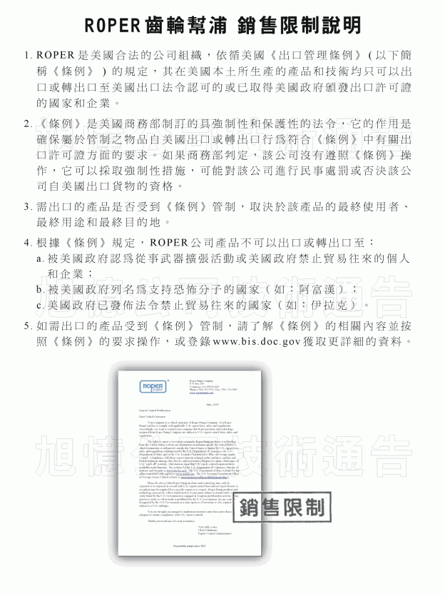 技術通告 “ ROPER 齒輪幫浦銷售限制說明 ” 內容如下,請參考: