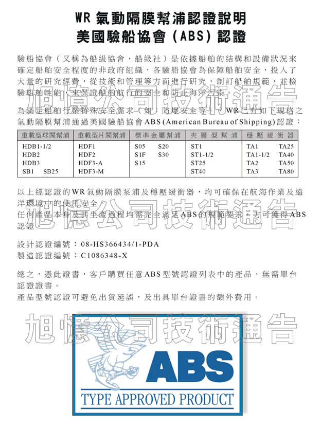 技術通告 “ WR 氣動隔膜幫浦認證說明美國驗船協會(ABS)認證 ” 內容如下: